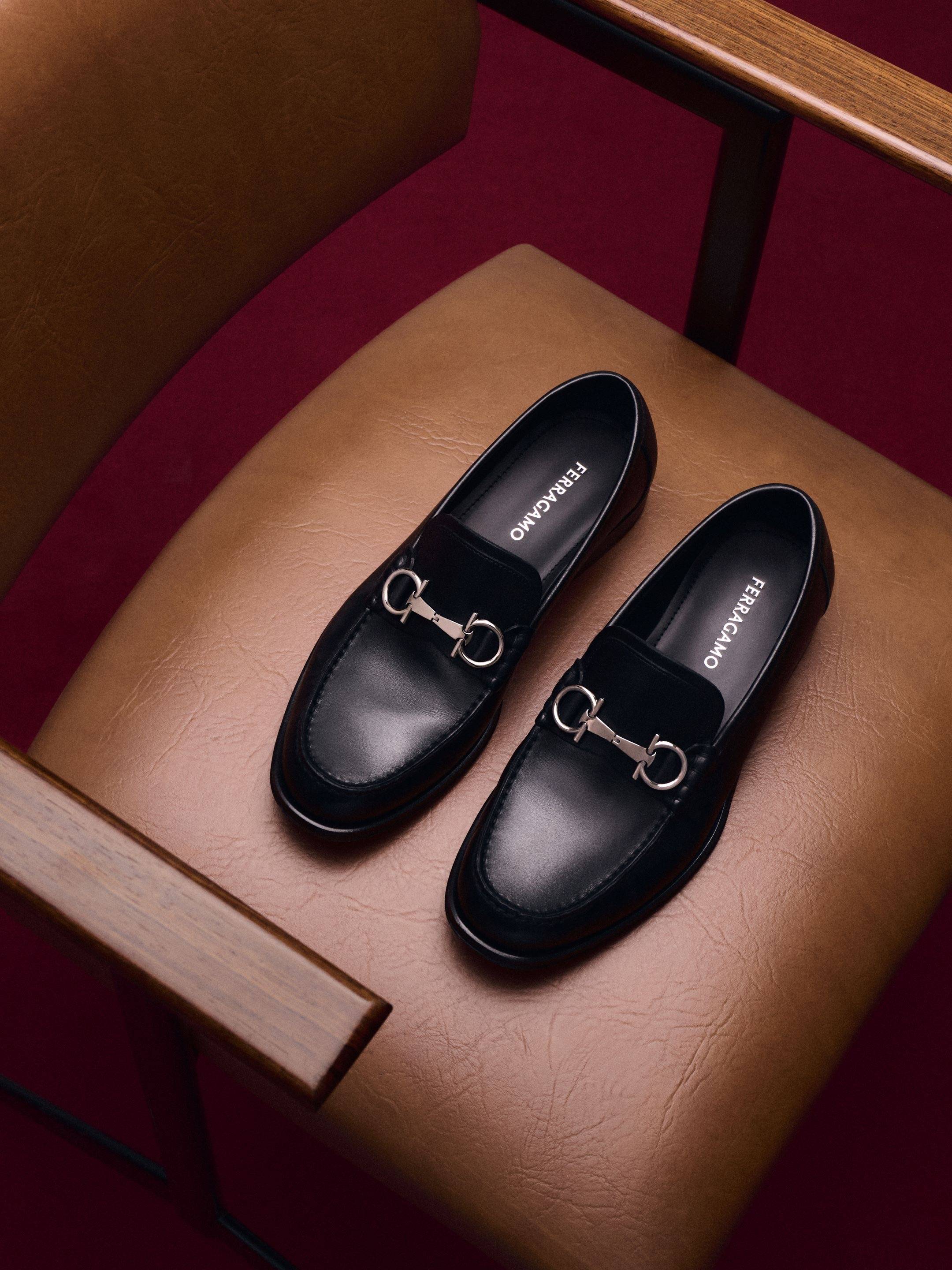 鞋履方面,经典黑色乐福鞋饰以Gancini扣饰,风格百搭,轻松驾驭不同场合。