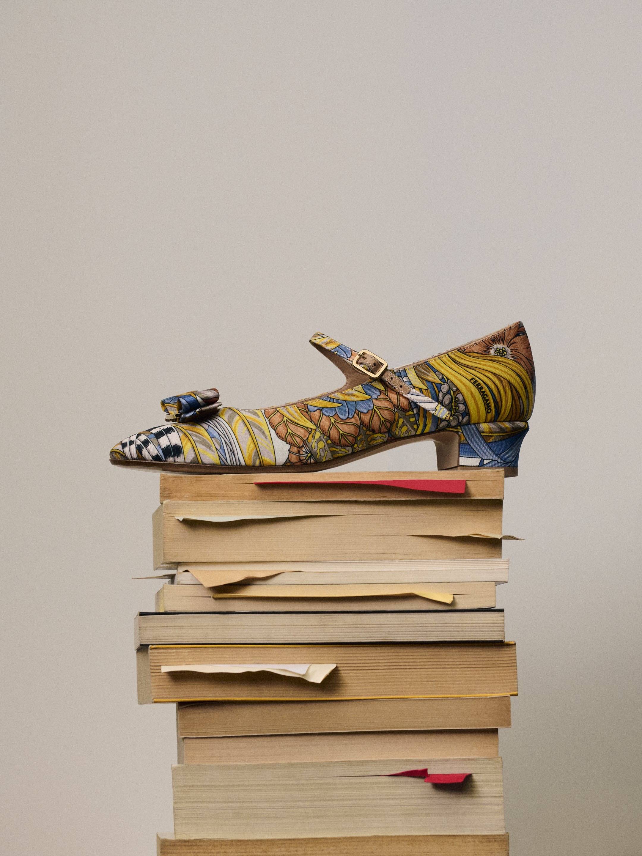 鞋履方面,特别款玛丽珍鞋搭配雕塑感鞋跟与Vara蝴蝶结,饰以蓝色、红色、白色及黑色构成的多色花卉印花图案。